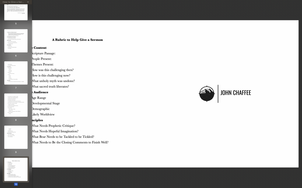 In this we talk through the spirituality of giving a sermon, how to keep attention, the delivery, how to "tackle the bear to tickle the bear", setting people free from unholy myths, method acting your audience, when silence is a good thing, using bicycles in your sermon, and more.